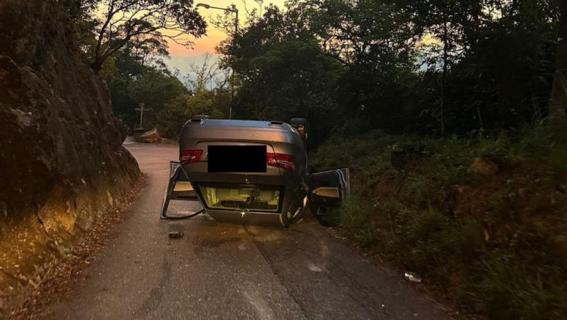 飛鵝山扎山道,今日(16日)下午6時許,一名22歲男司機駕駛私家車落斜,駛至近普救廟一彎位時,失控撞壆四輪朝天。所幸司機與乘客自行爬出車廂,沒有大礙,警方消防接報後趕至處理。受車禍影響,扎山道一度全線封閉。