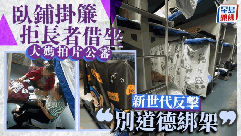 近日,內地網絡有大媽上傳短片,顯示在火車間內,不滿左右兩邊的下鋪乘客均用掛簾圍起來,令其他中、上鋪年長乘客無位可坐,只能長時間「屈就」在自己狹小不能坐起來的鋪位,批評現在的年輕人太自私,完全不理會年長者的難處,不讓70歲的老人借坐下鋪,呼籲網民公審。