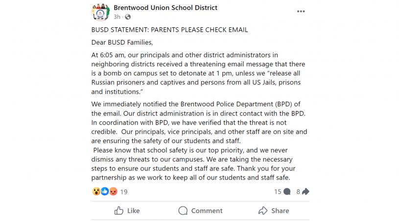 多個校區收到炸彈恐嚇,聲稱要求美國釋放俄羅斯囚犯。包括布倫活(Brentwood)和奧克利(Oakley)兩所高中在內的自由聯合高中校區(Liberty Union High School District,LUHSD)助理學監福克納(Erik Faulkner)發信學生家人表示,「全州各地學校都有收到同樣威脅。
