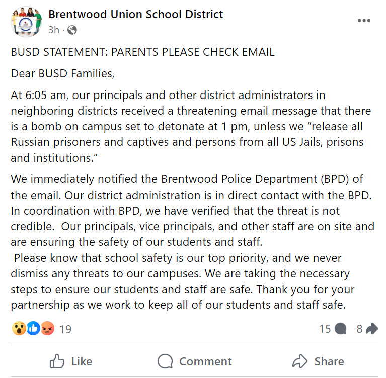在康縣當地,至少有五個校區在周三清晨收到恐嚇郵件,立即發出警告通知學生家長。包括LUHSD校區、布倫活聯合校區、安迪奧聯合校區、匹茲堡聯合校區和魔鬼山聯合校區(Mt. Diablo Unified School District)。