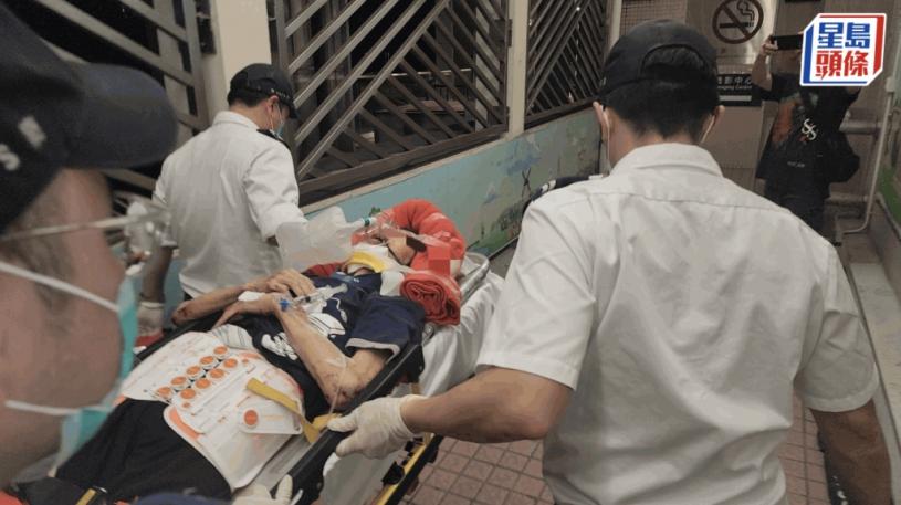 救護員將傷者抬上救護車送院。黃文威攝