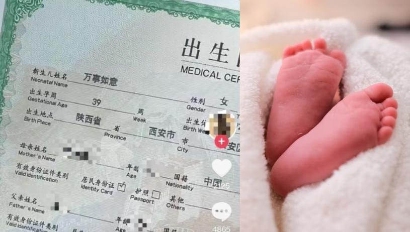 一名內地網民日前通過短片平台發布影片,展示出一張出生證明,其中孩子姓名為「萬事如意」,簽發機構為西安國際醫學中心醫院,並配文:「這名字不算爛大街(通街都係)吧」,引發網民討論。