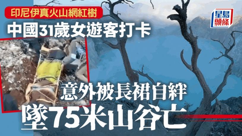 中國一名女遊客在印尼活火山「伊真火山」(Kawah Ijen)一棵出名的網紅樹「打卡」時意外被長裙絆倒,跌落75米下的山坡身亡。