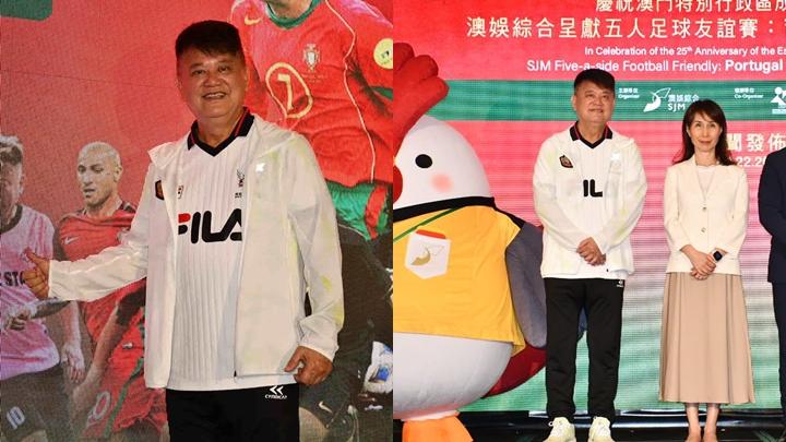 陳百祥(阿叻)與陳志康以「大灣區飛龍」球隊領隊身份到澳門,與澳娛綜合常務董事何超鳳,出席慶祝澳門特別行政區成立25周年「葡萄牙傳奇隊對大灣區飛龍」五人足球友誼賽記者會。