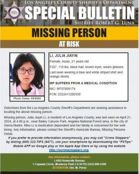 這名失蹤的女性為李佳音(音譯:Julia Jiayin Li),從其姓名及外貌判斷為華裔女子。她最後一次出現是週日(21日)的下午4點左右,地點是洛杉磯國家森林地區的貝利峽谷公園(Bailey Canyon Park),該公園是洛杉磯郊區馬德雷山脈(Sierra Madre)附近的一個受歡迎的徒步旅行目的地。