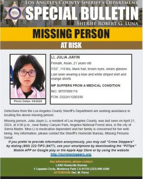 警方鼓勵任何了解李佳音下落資訊的人聯繫洛縣警局失蹤人員部門,可播打電話323-890-5500,或使用犯罪防治熱線800-222-8477。洛杉磯訊