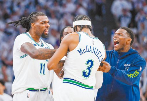 對陣太陽的第二場比賽中,森林狼球員在一起慶祝得分。路透社