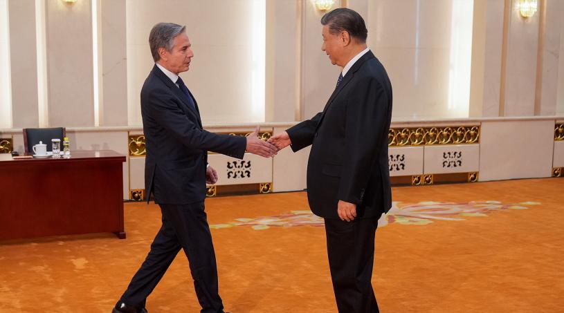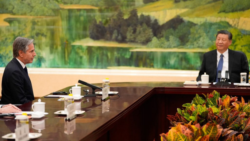 圖為美國國務卿布林肯(左)今年4月26日到訪北京與中國國家主席習近平見面會談。美聯社