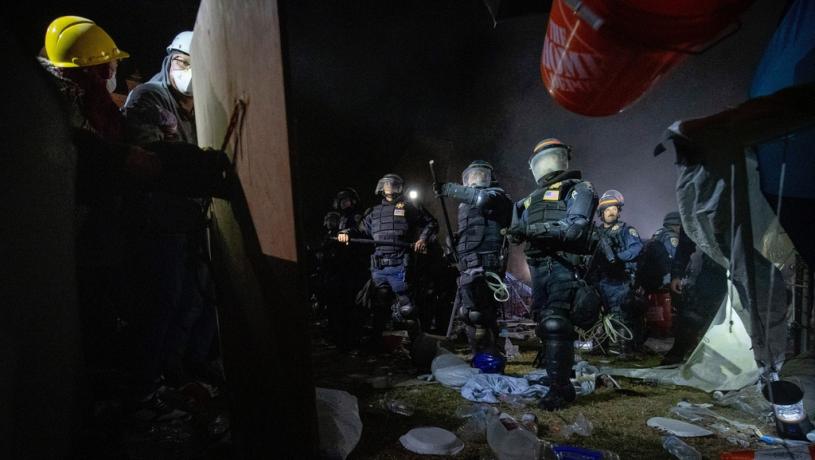 綜合美聯社及路透社報道,周四凌晨時分,數百名穿着頭盔的警察,以擴音器警告,若示威者不散去,就會被逮捕,並敦促示威者清理抗議區。警方在外校集結數小時後,大約凌晨3時許採取行動,進入加州大學洛杉磯分校,一字排開推進,並拆除校內支持巴勒斯場示威者的路障及營地。據報,警方向示威者投擲閃光燈,示威者則手牽手阻止警方前進,有示威者與警察發生糾纏。