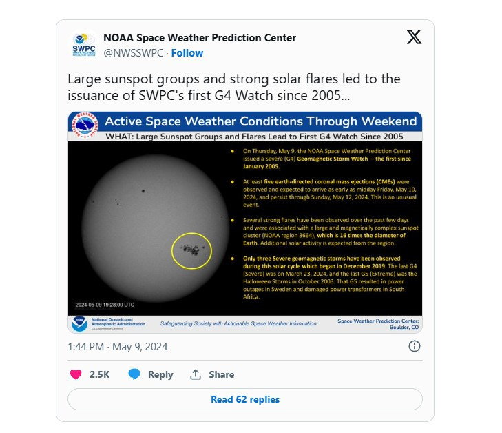 同時,由於風暴的強度,地球磁場的干擾可能會導致通信中斷和電力中斷。位於東灣屋崙的 Chabot 太空和科學中心的天文學家 Gerald McKeegan 提醒大家:“如果您發現喜愛的電視台突然無法正常播放,或者手機暫時無法使用,請不要感到驚訝。但通常情況下,這些問題應該會很快得到恢復。”他說:“這只是大自然在提醒我們誰才是老大。”