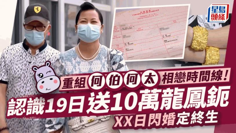 根據何伯與何太向《東張西望》提供的結婚證書,顯示兩人在3月11日結婚,當時兩人相識只有45日,約一個半月已定終生。何伯當時亦再向新何太送上價值13萬元的2卡鑽戒,以及逾10萬元的勞力士腕錶作結婚禮物,即何太當時已至少獲何伯送贈逾33萬元的首飾。