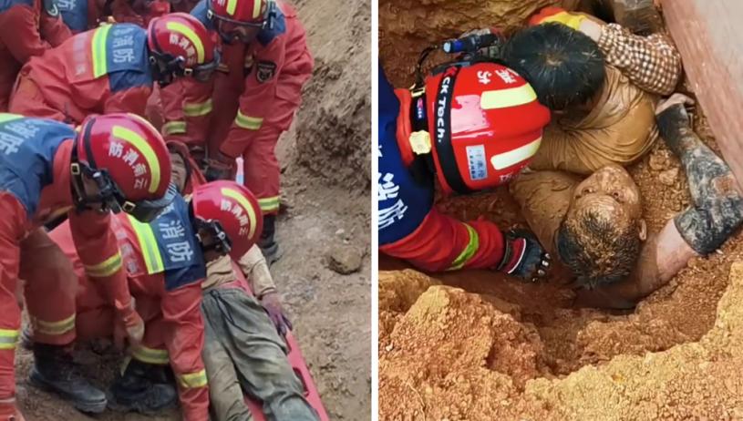 雲南西雙版納一茶廠地陷,消防員搶救被困人士。 中國消防