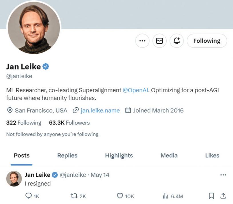 剛辭職的人工智能(AI)新創公司OpenAI高層雷克(Jan Leike) 在社交平台X發文,坦言這家具影響力的AI公司「將安全屈服於閃亮的產品下」,又暗示這是他離開公司的導火線。