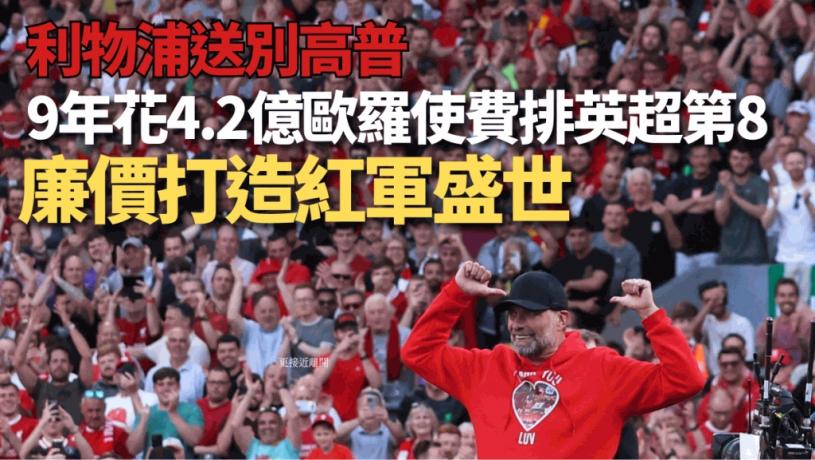 利物浦於周日的英超煞科戰主場2:0擊敗大部份時間十人應戰的狼隊,以勝仗送別領隊高普;賽後利物浦於晏菲路球場為高普和其團隊進行歡送儀式,場面感動。高普執教紅軍9年共獲8項錦標,其間淨支出4億2000萬歐羅,使費只排英超第8,難怪他深得球會高層和球迷歡心。