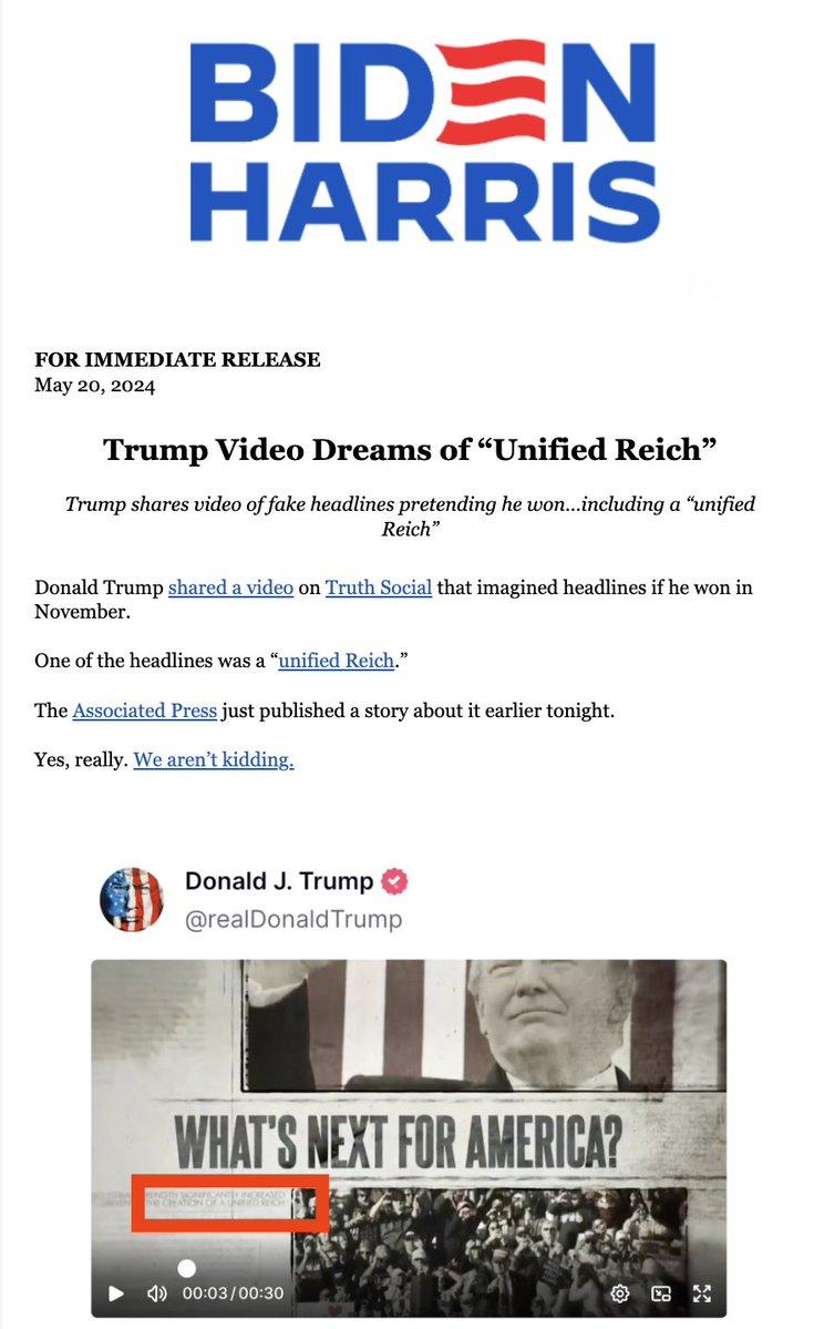 前總統特朗普在社交媒體分享短片,當中赫然提到「統一帝國」(Unified Reich)的說法,不但令人聯想到納粹時代的「第三帝國」(Third Reich),而且同樣引用德語單詞「Reich」,引起外界廣泛爭議。