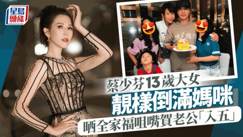 50歲的蔡少芬與內地武打影星張晉結婚16年,並育有兩女一子,組成一家五口幸福家庭。昨日(19日)張晉喜迎50歲生日,獲太太蔡少芬及子女們為他慶生,蔡少芬更發表愛的宣言:「愛你一生一世!有你我們才精彩,有你我們才完整!」13歲的大女張楚兒長得亭亭玉立,更激似媽媽蔡少芬。