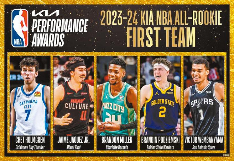 入選最佳新秀陣容一陣的5人分別是文班亞馬、雷霆的霍姆格倫、勇士的波傑姆斯基、黃蜂的布蘭登.米勒,以及熱火的小海梅.哈克斯。其中文班亞馬和霍姆格倫都是99張全票一陣,米勒獲得97張一陣選票。
