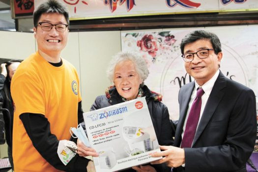 金物華醫生在母親節醫療講座中頒贈電飯煲給一位抽中大獎之婆婆。