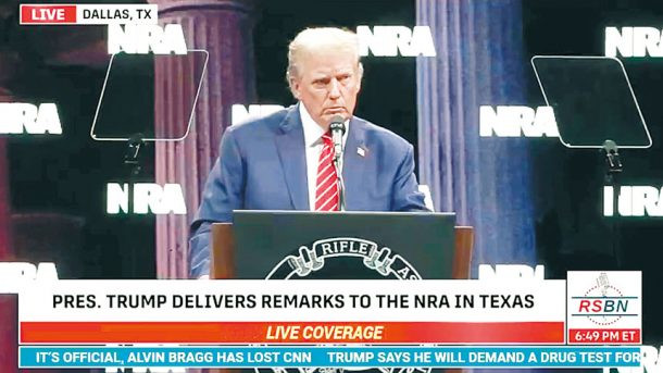 特朗普周末在達拉斯出席全國步槍協會(NRA)的年會,得到協會表態支持他競逐總統,然而演說期間一度停止發言。有網民猜測,可能是讀稿機出了問題,但特朗普本人否認,堅稱沈默30秒是刻意安排,又批評拜登團隊散播「假消息」,拜登才經常「僵住」,無法連貫說出2句句子。
