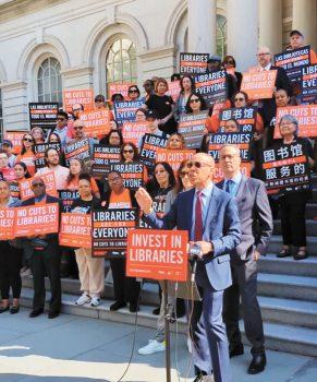 紐約三大公立圖書館系統總監昨(21日)率眾多圖書館員工在市府門前舉行集會,抗議市府削減近6000萬美元圖書館經費的計劃,同時市府還計劃自2008年以來首次削減圖書館的基礎建設經費。集會者表示,經費削減將導致大多數公立圖書館降至每周五天服務,同時也將影響到圖書館設施的修繕以及目前正在裝修的一些分館的按時開放。他們呼籲紐約民眾致信民選官員,一起保住圖書館經費。