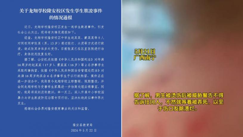 南寧隆安教育局22日通報,經查,龍翔學校隆安校區中學生趙某某、蒙某某等8人對同校同學張某(男,13歲)通過毆打、水燙等方式進行欺凌,造成張某身體多處受傷。目前張某已在區直醫院進行治療,身體狀況恢復良好。