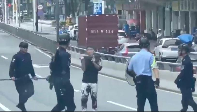 網上發布的視頻顯示,事發地距離鎮遠大橋不遠,當時街路上的行人已經被警方疏散。一名身著黑色短袖T恤的青年男子被七八名全副武裝的警察圍在中間。由於青年男子似乎用一把菜刀抵住了自己脖子,所以警方並未對其實施抓捕,而是一直在男子周圍,不斷通過喊話,試圖讓男子放下武器。