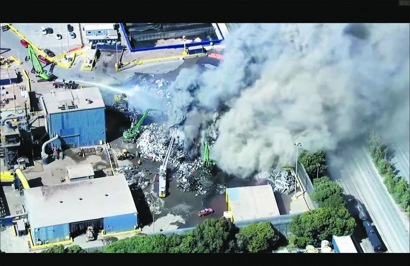 中半島紅木城(Redwood City)一座金屬回收廠22日發生大火,大量濃煙竄出,遮蔽中半島大片天空,消防員緊急搶救。