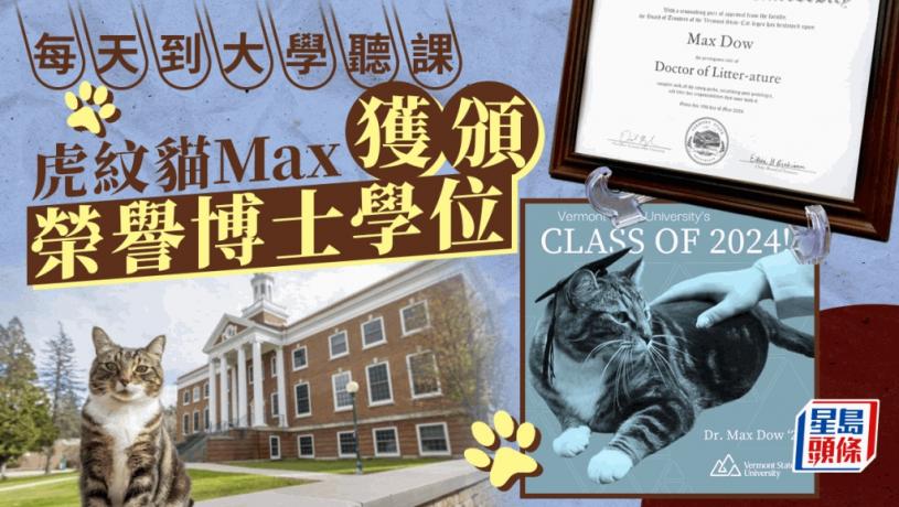 美國佛蒙特州立大學卡斯爾頓校區日前舉行畢業禮時,為虎紋貓Max頒發文學榮譽博士學位,以表揚這隻貓貓過去5年幾乎天天到校聽課,非常勤奮。校方此舉獲得全體教職員贊成,幾乎所有學生也替Max開心。