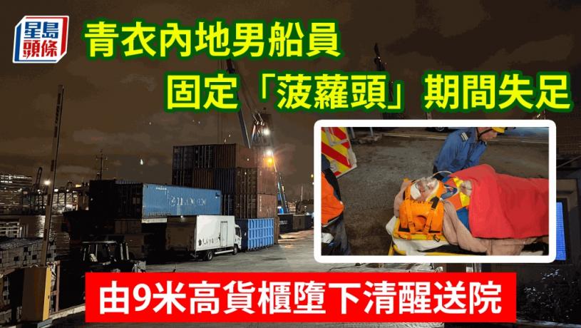 青衣發生工業意外。昨(23日)晚上11時許,青衣長輝路38號對開海面,一名內地男船員由船上約9米高位置墮下,他腳部骨折,頭部受傷,有人發現後報警。救援人員趕抵現場,姓洪(57歲)事主仍保持清醒,消防員將他運到消防輪碼頭,再由救護員送往瑪嘉烈醫院治理。消息指,男船員正於船上貨櫃,處理俗稱「菠蘿頭」的組件,將貨櫃固定,期間懷疑失足由9米高的貨櫃墮下受傷。警方正調查意外原因。