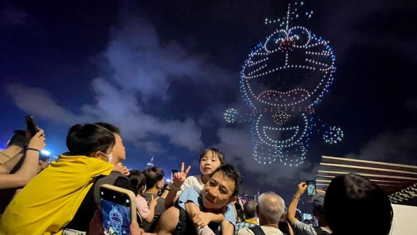 「多啦A夢」巡迴特展獲政府納入本港盛事之一,1000架無人機今晚表演約15分鐘,在配音演員聲演下,展現多啦A夢及好友戴着竹蜻蜓翱翔天空等圖案。