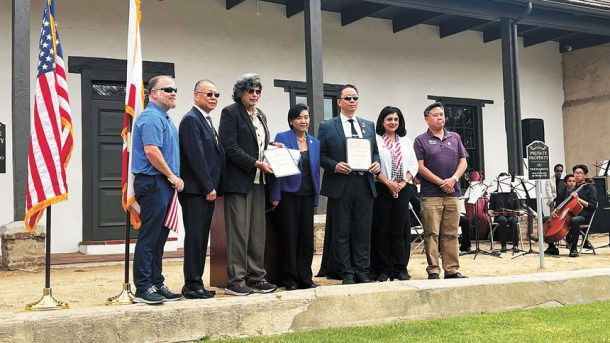 國殤日聖蓋博市首次舉辦大型紀念活動,趙美心(中)出席並頒發賀狀。聖蓋博市提供