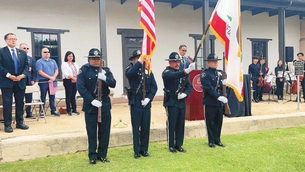 聖市警察局組織國旗儀隊引領美國國旗進場。聖蓋博市提供