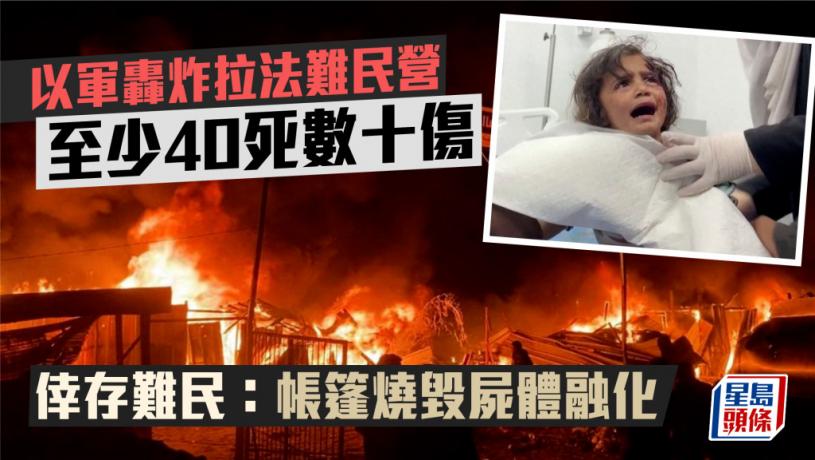 以色列在中部受到火箭彈襲擊後,轟炸加沙南部拉法一個難民營,引發大火,造成至少40人死亡,數十人受傷。巴勒斯坦紅新月會說,難民營內有大量無家可歸者,有大批人被困火場,救援人員難以抵達。以軍則聲稱襲擊目標是一處屬於哈馬斯的大院,今次空襲行動炸死巴勒斯坦武裝組織哈馬斯一名指揮官和一名高級官員。