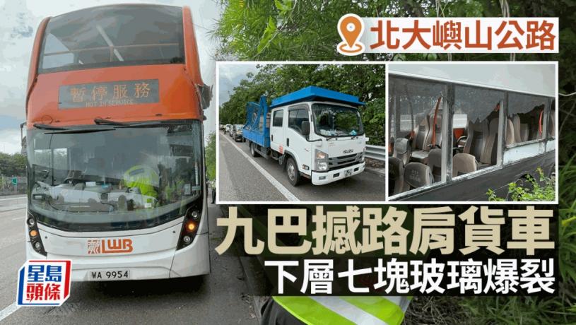 現場所見,巴士左邊下層多個玻璃窗爆裂,碎片散滿座位上,下層乘客首當其衝,被激射而出的玻璃碎鎅傷。據悉,貨車當時因故障停泊路肩,九巴左邊車身撞到貨車右邊車身,下層七塊玻璃應聲爆裂。