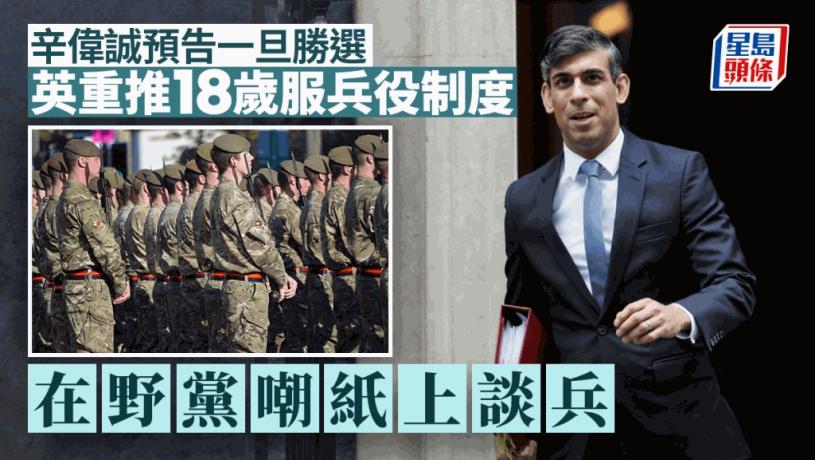 英國首相辛偉誠昨日(26日)撰文宣告,若所屬的保守黨在7月國會大選中勝出,將重新推動兵役制度,18歲男女公民要麼選擇服兵役,要麼選擇一年內,到警署、消防局或國營醫療系統進行25天義務工作,他認為這種服役文化可以令英國「更強大、更有凝聚力」,也樂見2名女兒當兵。如計劃落實,最快明年實施。