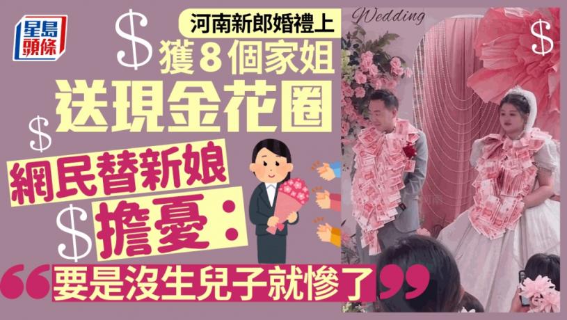 河南近日有一場婚禮,出現新郎的親姊姊逐個上禮台,為一對新人掛上現金花圈祝福,畫面引起網民熱烈討論,原因並非現金彩禮豐厚,影像浮誇,而是新郎居然有八位胞姊,網民笑指男家是超生游擊隊,又擔心新娘如不能生出兒子,日後在這個超級重男輕女的家庭難以立足,更有人認為要和八個大姑仔相處,對新娘是空前挑戰,只能說句「真係恭喜你呀」。