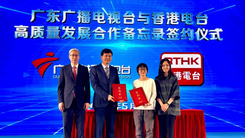 簽署儀式於深圳國際會展中心舉行,助理廣播處長(電視及機構業務) 陳俊樂在衛懿欣及廣東台副台長鍾世勛見證下,與廣東台廣播電視台體育頻道總監黄宏簽訂合作備忘錄。