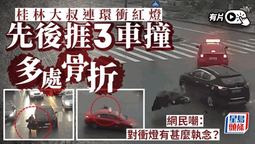 駕車衝紅燈,後果可以致命!廣西桂林有男子駕駛電動單車在一十字路口,居然兩次無視紅燈,在遭一輛汽車撞倒無大礙後,居然又再駕車繼續闖紅燈轉彎,結果被另外兩輛汽車接連撞倒,更被捲入車底,幸而只是身體多處骨折。