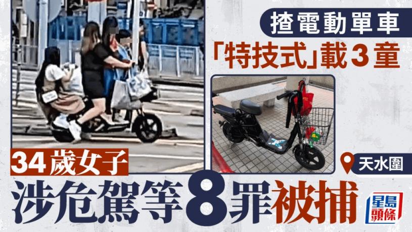 早前有網上片段流傳,指天水圍天壇街一名女子駕駛懷疑電動單車,猶如特技表演般「疊羅漢」載1名男童及2名女童,期間4人均沒有佩戴頭盔,更違反交通燈號橫過天瑞路,引起爭議。警方表示,非常重視案件並主動調查,新界北總區交通調查組人員經深入追查後,今日(5月27日)下午約2時半在天水圍區拘捕一名34歲本地女子,涉及危險駕駛等8宗罪,並檢獲涉案電動單車。