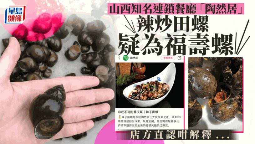 近日,內地網民在社交平台反映在連鎖餐廳「陶然居」山西運城加盟店所點的辣子田螺實為福壽螺,引發網民熱議。