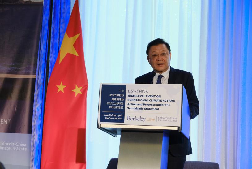 加州州長紐森(Gavin Newsom)、中國廣東省省長王偉中等5月29日參加在柏克萊市(Berkeley)舉辦的「美中地方氣候行動高級別活動:《陽光之鄉聲明》的行動與進展」。