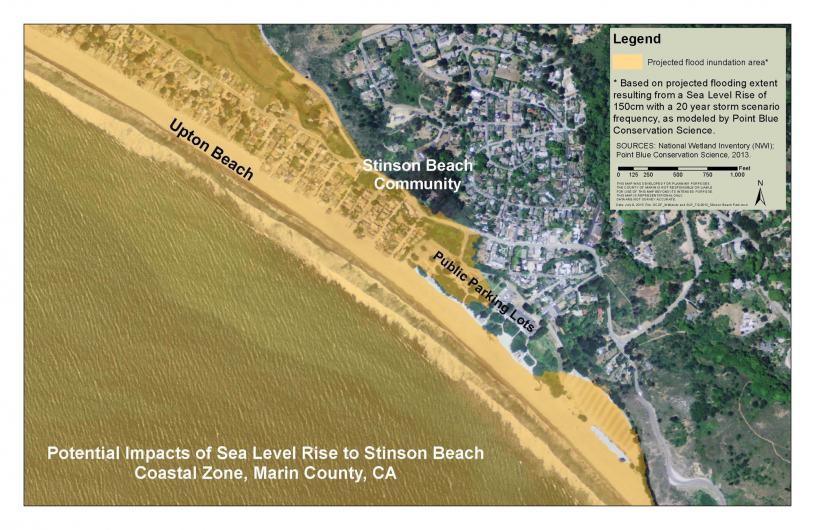 未來幾十年,斯汀森灘(Stinson Beach)的景觀將會改變,問題在於這種變化是由人們蓄意完成,或是上升的海平面引起的混亂變化。根據最近的分析,如果2040年至2050年海平面上升1.6呎,斯汀森潟湖沿岸的沙灘和植被沼澤預計將失去30%至40%的面積。