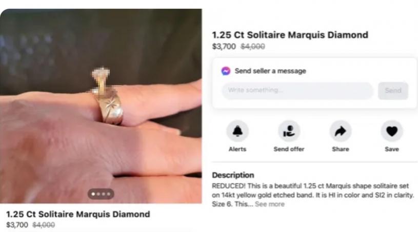 這枚戒指在 Facebook Marketplace 上標價 3,700 美元,它採用了想當大膽的有如後現代的設計,上面鑲嵌的馬眼形鑽石號稱有 1.25 克拉重。然而這枚鑽戒沒有買家,只有網友們瘋狂的嘲笑,不少人表示這是他們見過的最醜的設計,到了需要去洗洗眼睛的程度。他們覺得鑽石醜,鑲嵌的角度更醜。作為一枚醜的鑽戒能醜成這樣,夫復何求?