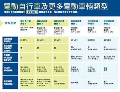 C類:2-3輪,時速限制為每小時20英哩(20MPH),建議所有騎乘者配戴頭盔,可以在右車道或路肩行駛,左轉除外。