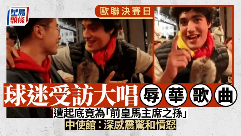 歐冠決賽當天,中國博主@球迷匯SHOWMI 遭遇皇家馬德里球迷種族歧視。中國駐西班牙大使館就西甲球會日皇家馬德里有球迷發表辱華言論,向皇馬提出嚴正交涉。使館表示,留意到個別球迷在訪問中辱華,言辭低俗、性質惡劣,對此深感震驚和憤怒。