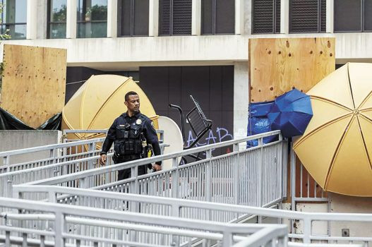一名大學警察走過被路障堵塞住的學生服務大樓入口。洛杉磯時報