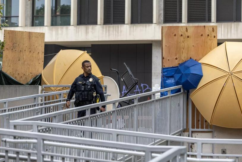 圖:一名校警走過被路障堵塞住的洛杉磯州大學生服務大樓入口。洛杉磯時報