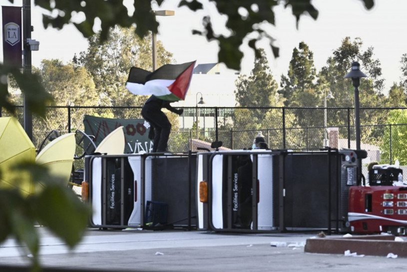 《洛杉磯時報》報道,一個多月前抗議者已在洛杉磯州大校園的另一區域紮營,到本周三(12日)下午,一群人突然開始在學生服務大樓和周圍廣場堆放家具、推倒設施服務用車和桌子,設置路障。