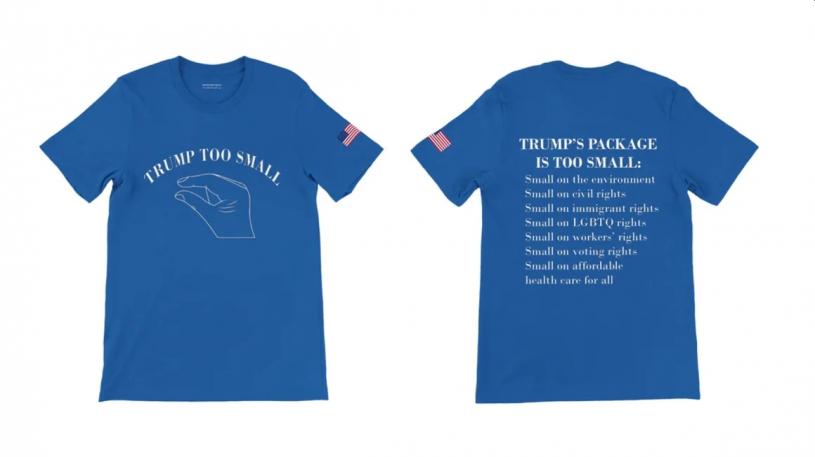 圖:在trumptoosmall.com網站上出售的「特朗普太小」字樣的T恤。trumptoosmall.com
