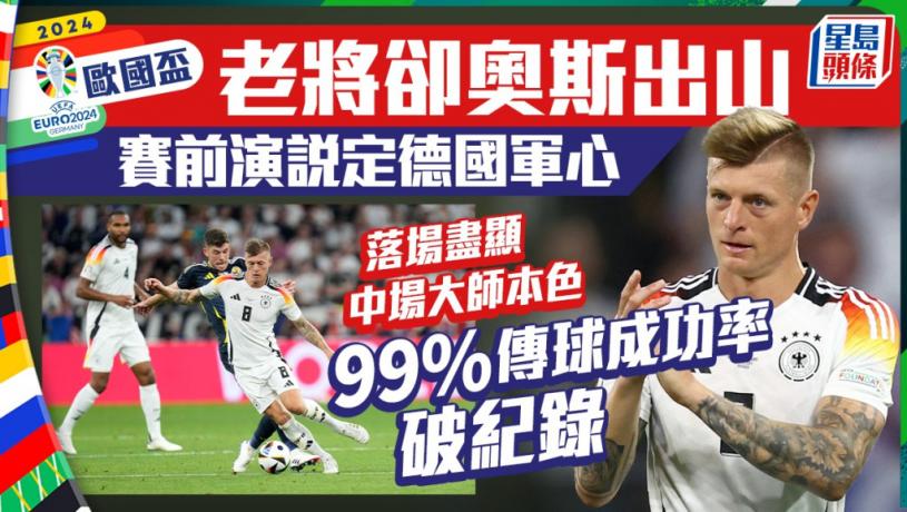 德國於周五歐國盃揭幕戰A組主場5:1大炒蘇格蘭,取得開門紅。今場是老將卻奧斯退出德國國家隊後,出山首度回歸國際大賽舞台,更即在場內外盡顯影響力,於賽前演說穩定軍心,場上則發揮中場大師本色,102次傳球只傳失1球,99%成功率破賽事紀錄。